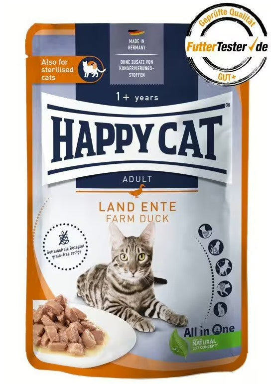 Nicht nur eine artgerechte Ernährung wird durch gutes Katzen-Nassfutter mit hohem Fleischanteil sichergestellt. Hochwertiges Futter wie unser getreidefreies Happy Cat Meat in Sauce Culinary Land-Ente leistet einen wichtigen Beitrag für einen geregelten Flüssigkeitshaushalt – und unterstützt so einen gesunden Harntrakt. Das nach unserem Natural Life Concept zusammengestellte Nassfutter für Katzen enthält über 90 Prozent tierische Proteine am Gesamtprotein. Es unterstützt die wichtigen Aspekte der Tiergesundheit wie den Magen-Darm-Trakt, das Herz und Fell, das Immunsystem und die Haut. Es eignet sich zudem zur Fütterung sterilisierter und kastrierter Tiere. Bei unserem ernährungsphysiologisch bestätigten All in One-Konzept sind alle wichtigen Vitamine und Mineralstoffe enthalten. Du benötigst neben dem Nassfutter also keine weiteren Nahrungsergänzungen.